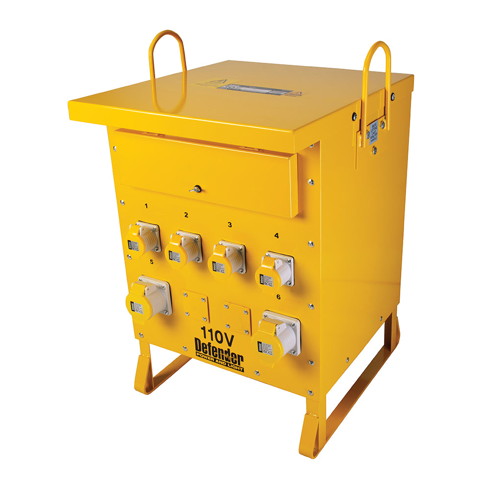 3-phase, heavy duty transformer with 4 x 16A and 2 x 32A 110V outlets. Hard-wearing steel enclosure. Elevated underside for improved access. Double wound with safety earth screen. Supplied without plug or cable. Intermittent rating 10000VA. Continuous rating 7000VA. Duty cycle 5 mins on / 15 mins off. Ingress protection rating: IP44. BSEN 61558-1 compliant. Dimensions: 775 x 515 x 800mm. Weight 80kg.