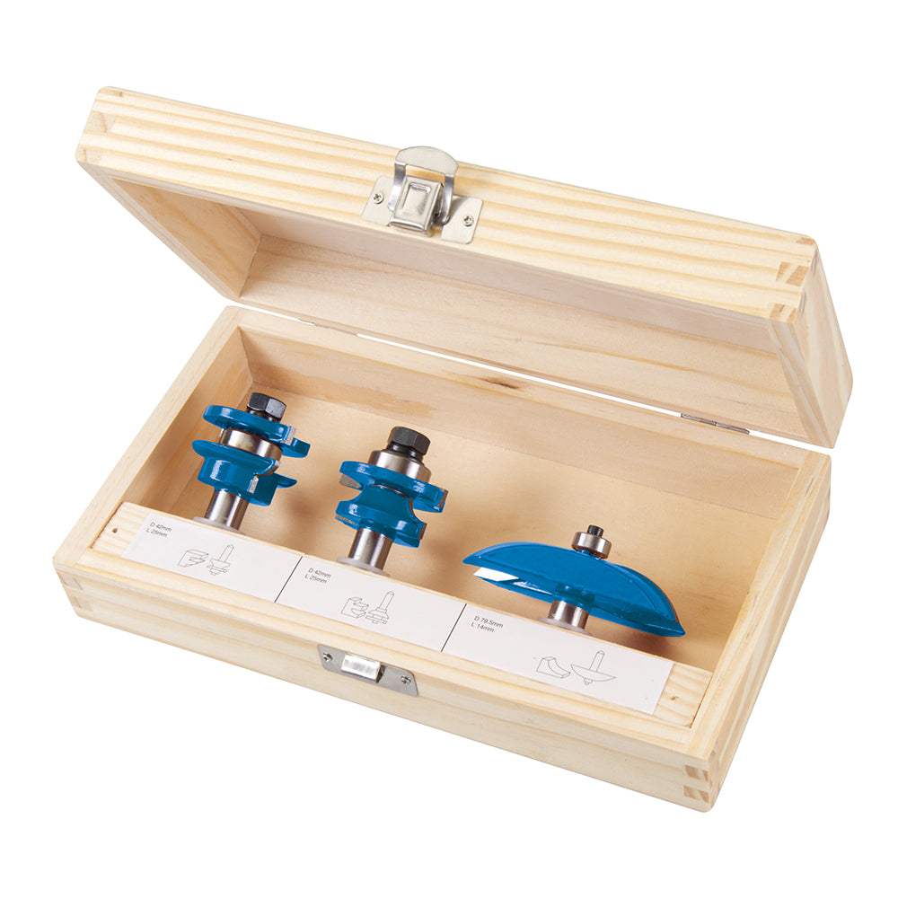 Comprehensive panel door 1/2" shank router cutter set with TCT cutting edges and strong, hardened steel shanks. Includes 2 x 1/2" rail and stile bits, and 1 x 1/2" raised panel bit.