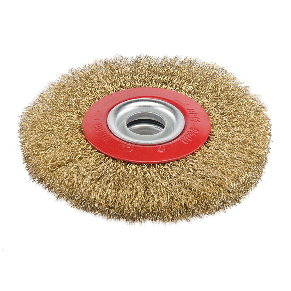 Hardened and brassed 0.3mm steel wire bristles. For deburring, derusting and descaling, as well as paint removal, finishing and surface preparation. Can be stacked onto tapered spindles to achieve required thickness. Supplied with bore adaptors.