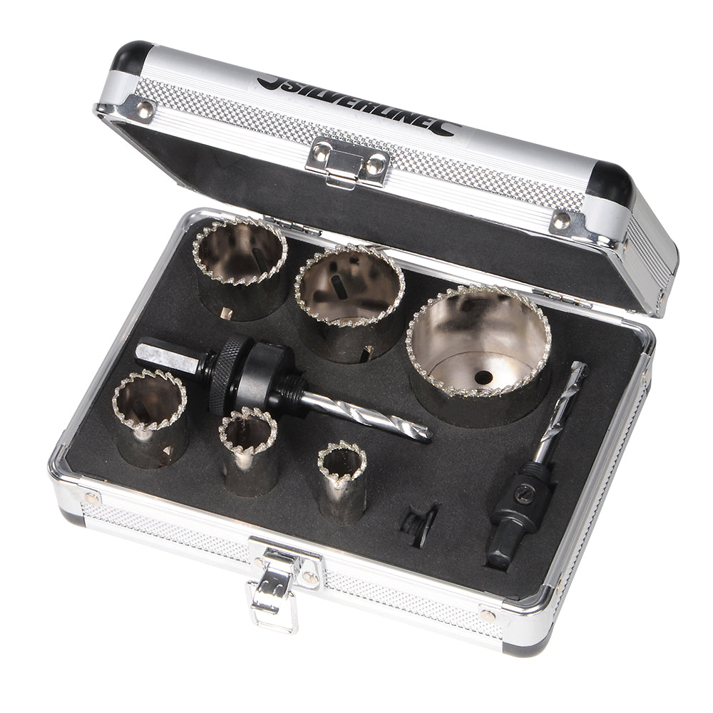 Diamond grit tipped holesaw kit. For cutting marble and ceramic tiles. Also suitable for MDF, chipboard and plywood. Includes 19, 22, 29, 38, 44 and 57mm holesaws; 2 x arbors; 2 x 8mm pilot drills and mandrel adaptor. Fitted aluminium storage case.