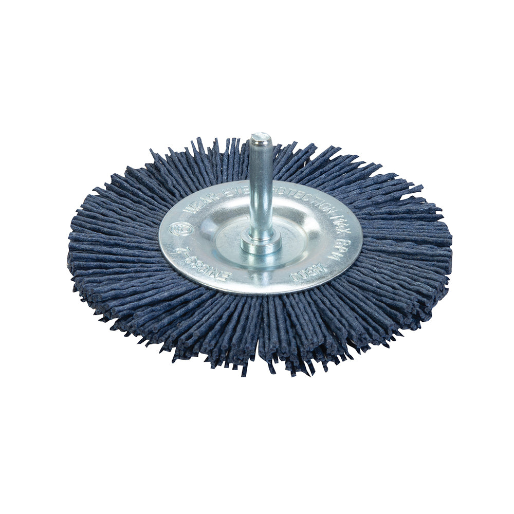Nylon threads impregnated with silicon carbide grit for deburring and surface treatment of metal and wood. Non sparking. 6mm shank.