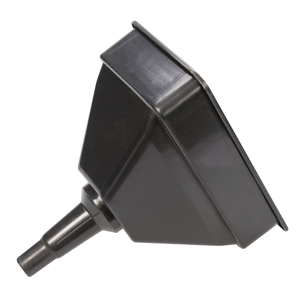 Versatile polyethylene funnel holds up-ended oil containers. Features tapered spout and venting ribs and filter. Resistant to oil and fuel.