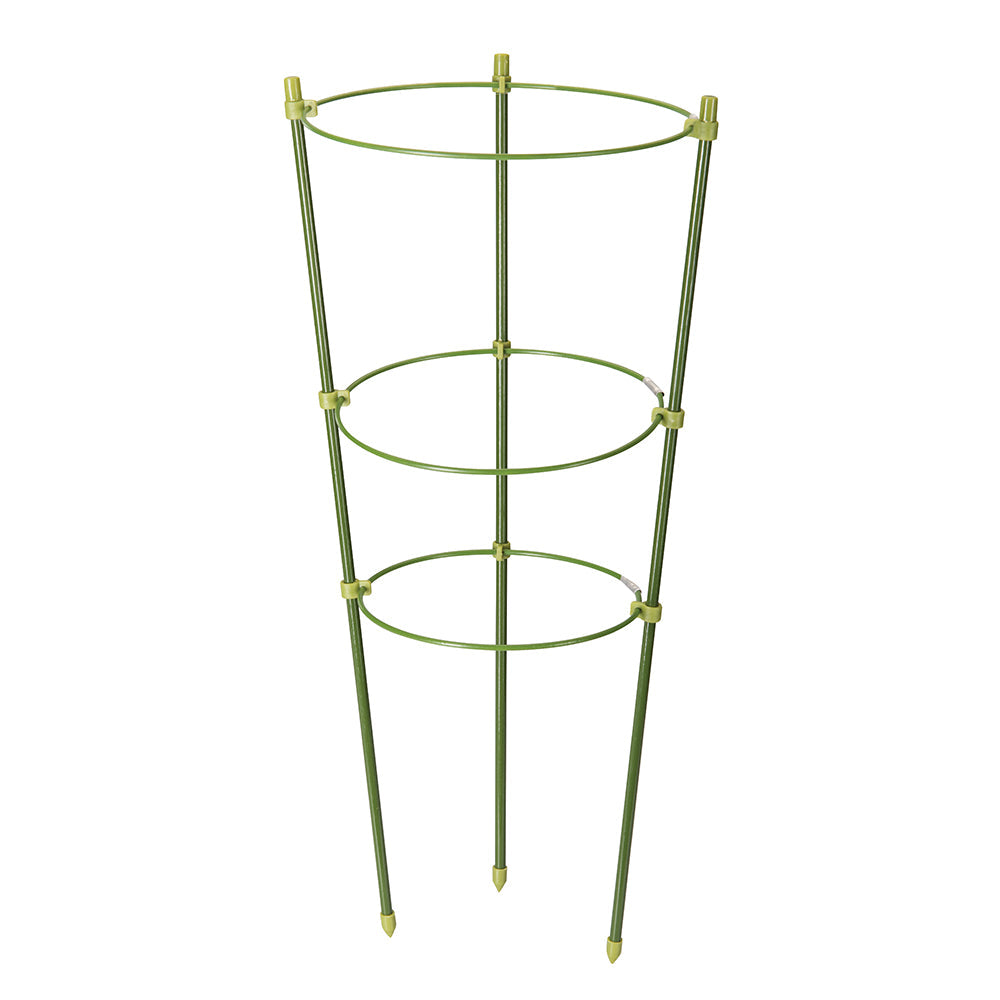 Aluminium and green plastic construction. Provides support for growing plants, including vegetables. Folds flat for convenient storage. Includes 3 support legs and 3 ring supports. Ring sizes: 140mm, 155mm and 175mm dia. Assembled height 450mm.