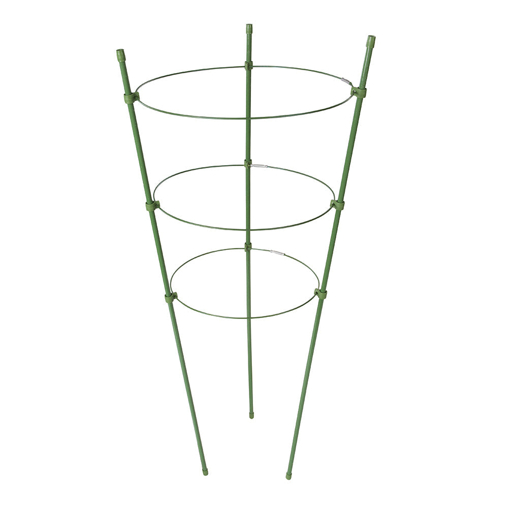 Durable steel ring support with rust-resistant plastic coating provides stability to vigorous and growing plants. Subtle appearance but very effective when used to support bushy and splaying plants. Folds flat for convenient storage. Includes 3 support legs and 3 ring supports. Ring sizes: 180mm, 200mm and 220mm. Assembled height 600mm.