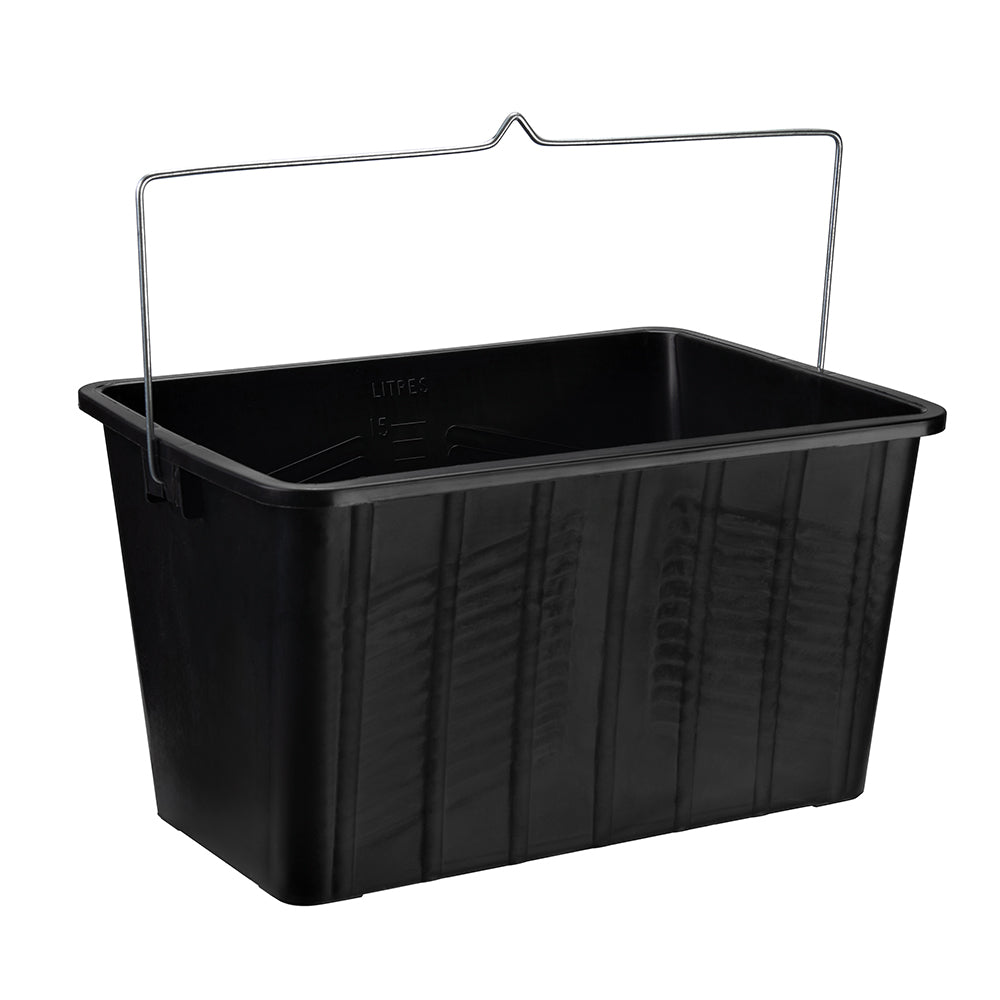 Deep 15Ltr (3 gallon) paint scuttle made from polypropylene with strong 4mm galvanised steel handle shaped for easy hanging and storage. Ribbed surface and lipped rim for added strength. Internal measuring scale and raised ridges for loading and removing paint. Rectangular shape allows effective application of paint, emulsion and paste. Suitable for decorators and window cleaners. Easily accommodates 9" and 12" rollers and squeegees. Calibrated in litres and gallons. Size (W x D x H): 395 x 285 x 230mm.