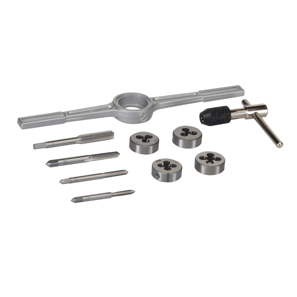 M4, M5, M6 and M8 taper taps and dies. 'T' type tap wrench and cast alloy die holder. High carbon steel.